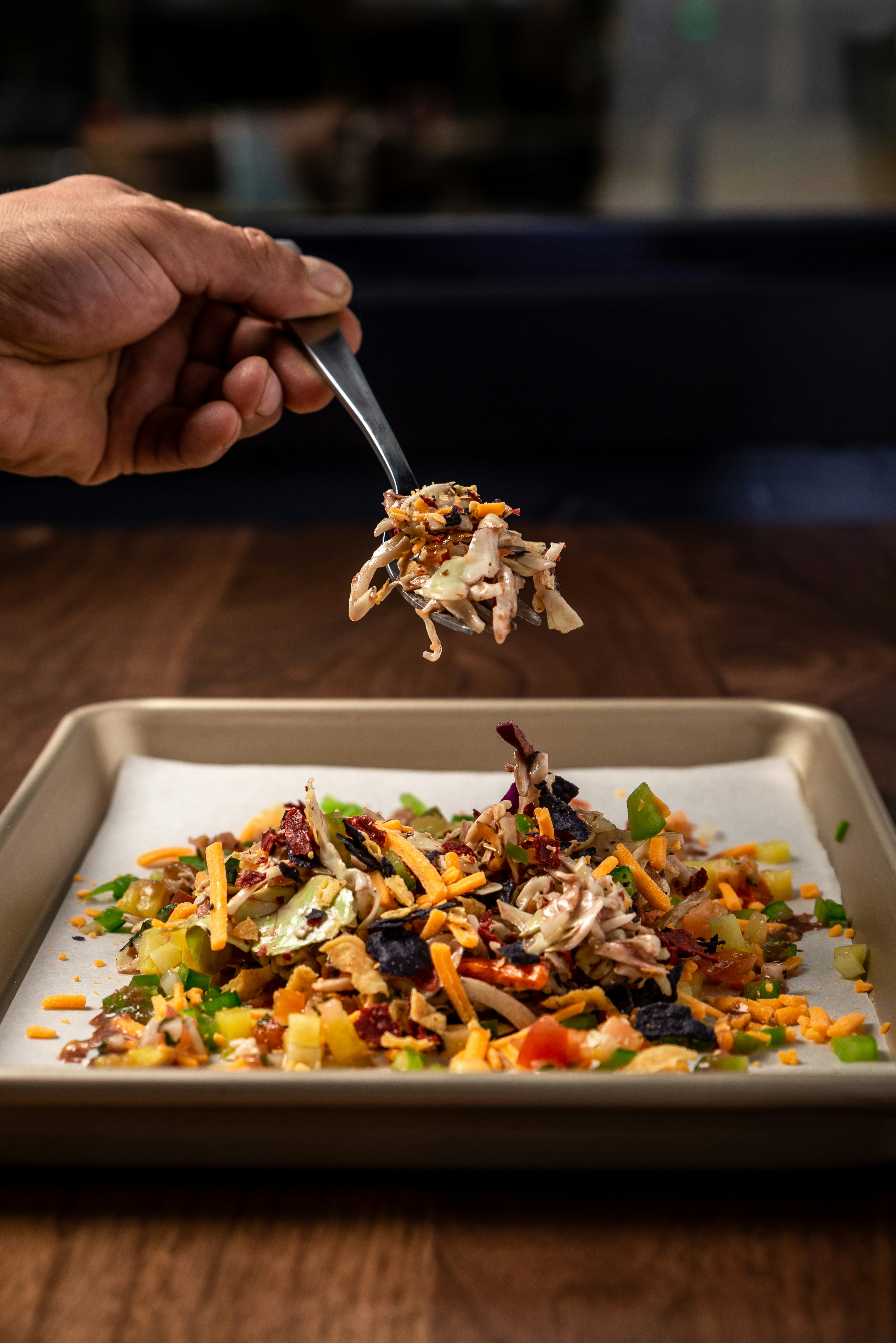 2. Demonstrate how to use the spoon by scooping up food and bringing it to your mouth.